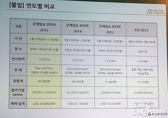 '게임에 가치를 더하다'(Play and Plus!)라는 주제로 진행되는 '굿게임쇼코리아2015'는 오는 5월 29일부터-31일까지 경기도 일산 킨텍스 제2전시장 10홀에서 개최된다. 작년에는 총 60,395명의 관람객이 찾아왔고 올해 목표는 65,000명의 관람객을 유치하는 것이 목표라고 한다.