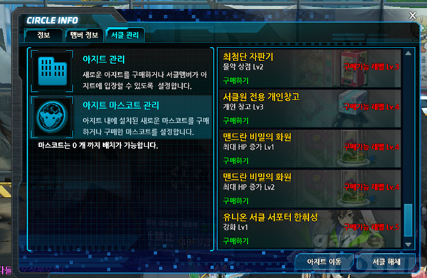▲ 서클 관리에서 아지트 및 마스코트를 관리할 수 있다.