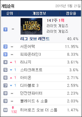 한편 국내 PC방 점유율 순위는 롤-서든어택-피파온라인3의 3강체제고 이어 엔씨소프트의 MMORPG형제들인 리니지-아이온이 차지하고 있다.
