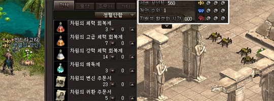 100만: 서버 랭킹 3위 내 플레이어에게 텔레포트 구슬 지급 20초 동안 구슬 주변 아군을 20명씩 테베라스 피라미드 내부 중심 지역으로 이동