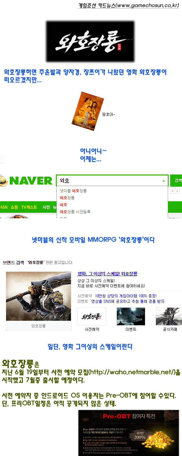 '몬스터길들이기-레이븐-크로노블레이드'를 잇는 넷마블의 신작 모바일 RPG(역할수행게임) '와호장룡'이 오는 7월 출시 예정이다. 이에 게임조선에서는 카드 뉴스로 미리 만나는 와호장룡 편을 준비했다.