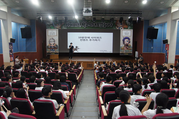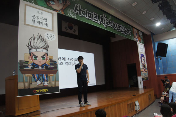 이날 행사는 기획, 클라이언트, 서버프로그래밍, 원화 등 사이퍼즈 개발자의 강연과 함께 질의응답 시간 갖고 OX 퀴즈, 빙고 게임 등 약 300여 명이 모인 애니원고등학교 학생들과 함께 호흡하는 자리였다.