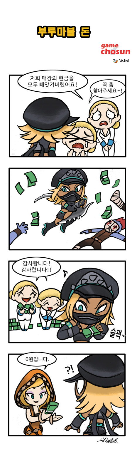하지만 이 도적이 드랍하는 '지폐 다발'을 필요 이상으로 수집하면 퀘스트를 완료해도 인벤토리에 지폐 다발이 남아있는다. 언뜻 추가 보상을 기대할 수 있는 상황, 하지만 이 '지폐 다발(퀘스트 아이템)' 자체가 잡화상인에게 0메소(메이플스토리2 화폐)로 인식되는 허상의 돈, '부루마불돈'이다. 카툰작가는 이런 퀘스트로 파생되는 소소한 내용을 4컷 만화 속에 담아냈다.