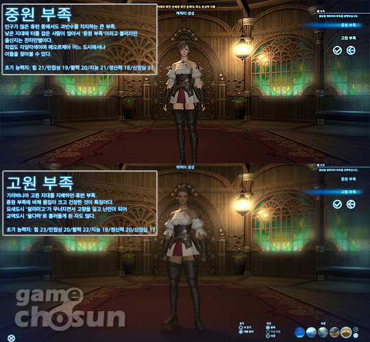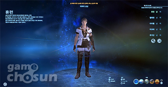 먼저 파이널판타지14의 다섯 종족, 휴런, 엘레젠, 라라펠, 미코테, 루가딘 중 하나를 선택하고 다시 성별을 선택해야 한다.