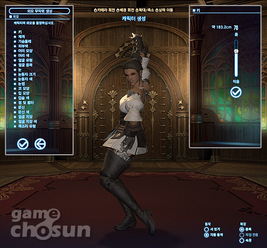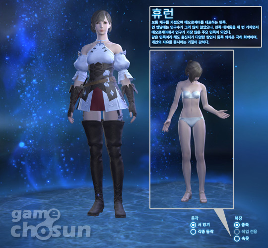 종족/성별 선택 단계에서 종족의 특징과 캐릭터의 각종 동작 그리고 복장 등을 미리 볼 수 있다.