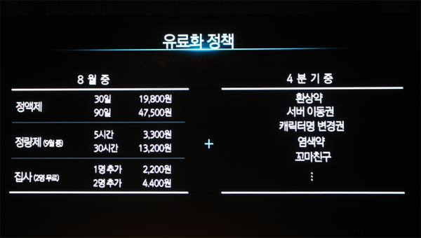 상용화와 동시에 도입되는정액제는 30일 19800원과 90일 47500원으로 나누어져 있다. 정량제는 5시간(3,300원)과 30시간(13,200원)으로 구성돼 있으며 9월 중 도입될 예정이다.