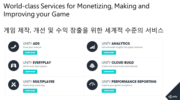 그 일환으로 게임 제작은 물론 사용자 유도와 수익 창출까지 고려한 통합 서비스인 '유니티서비스'를 강조했다. 유니티서비스는 게임을 통한 수익창출에 최적화된 글로벌 서비스로 유니티애즈, 유니티애널리틱스, 에브리플레이, 유니티클라우드빌드, 유니티멀티플레이어, 유니티퍼모먼스 리포팅 등으로 구성돼 있다.