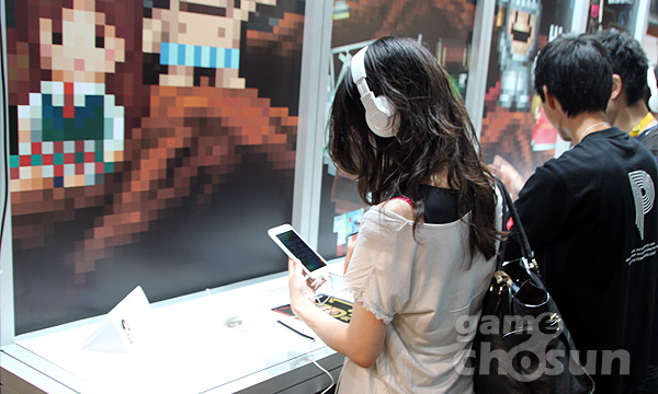 ▲ 귀여운 도트 캐릭터가 등장하는 신작 모바일게임을 시연하는 여성게이머