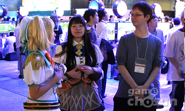 ▲ 코스프레 차림으로 소니 부스를 찾은 여성게이머들, 관계자에게 신작 소개를 듣고 있다