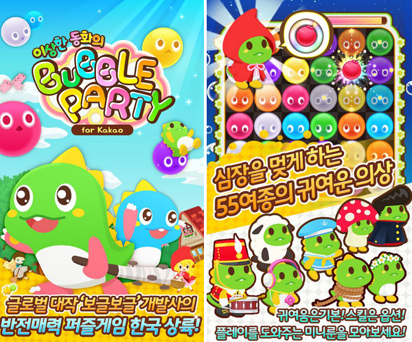 어릴 적 오락실에서 즐겼던 보글보글의 향수가 모바일 게임 '이상한동화의버블파티 for Kakao'로 우리 곁으로 찾아왔다. 기존에 출시된 슈팅게임 ‘퍼즐보블’과는 달리 이번에는 캐주얼 퍼즐 장르다. 친숙한 공룡 캐릭터 ‘버블룬’과 ‘보블룬’이 등장하는 이 게임은 일반적인 3매칭 퍼즐과 달리 라인 전체를 이동해 블록을 맞추는 방식으로 차별화된 재미를 추구했다.