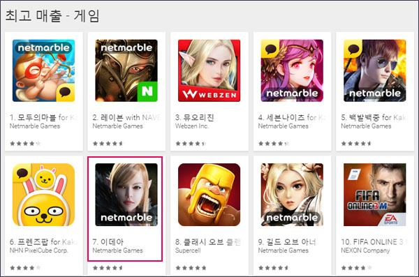 한편 넷마블은 구글플레이 매출 순위에 1위(모두의마블)-2위(레이븐)-4위(세븐나이츠)-5위(백발백중)-7위(이데아)-9위(길드오브아너) 등 총 6종의 게임을 서비스하며 모바일게임의 절대 강자를 차지하고 있다.