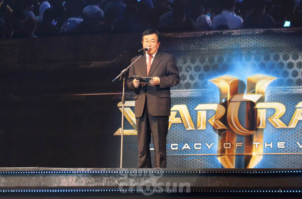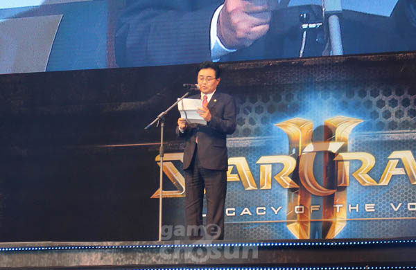 19) 전병헌 국제 e스포츠연맹 회장 "특별한 날인 만큼 원고를 준비했다. 팬 여러분 반갑습니다. 2010년에 자유의날개로 첫 비상을 시작한 스타크래프트2가 6년만에 마지막 이야기 공허의 유산을 선보이고 있다. 스타크래프트 시리즈는 1998년에 출시돼 전 세계적으로 사랑을 받고 e스포츠의 초석이 된 게임이다. 게임을 넘어서 신화-문화-역사 등 장대한 스토리를 넘어서 디지털 시대 최고의 창작물이다. 여러분도 그렇게 생각하시죠?"
