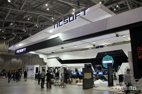 지스타 개막 하루 전날인 11일 엔씨소프트는 부산 벡스코 제1전시관에서 100부스 규모의 전시 부스 꾸미기에 여념이 없었다.