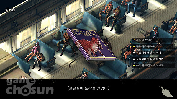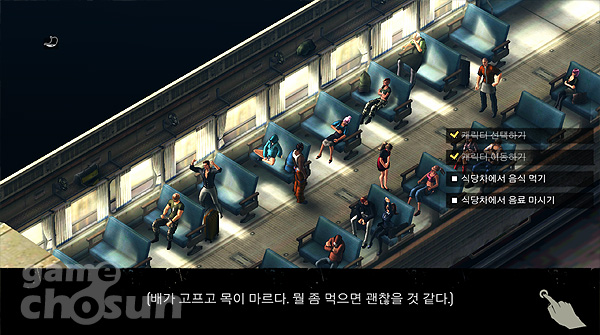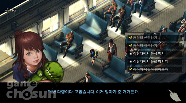 캐릭터를 선택해 생성하면 야생의땅:듀랑고 프롤로그가 시작된다. 허기가 지고 목도 마른 캐릭터는 무엇인가 섭취가 필요해진다. 캐릭터를 조작해 식당차로 이동한다.