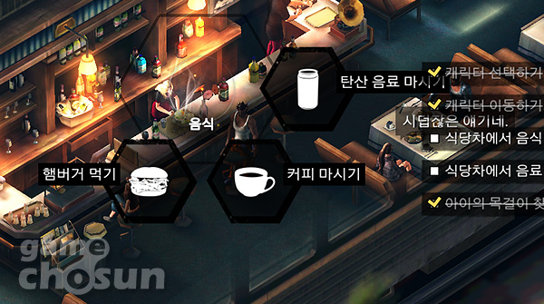식당차에 도착해 햄버거(음식)와 탄산음료 또는 커피(음료)를 선택해 이를 섭취한다. 캐릭터가 허기를 면하면 자리로 돌아간다.