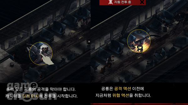 비명소리가 들리던 열차칸에 도착하면 경비원의 총에 맞은 공룡(랩터)을 만나며 전투가 시작된다. 캐릭터를 길게 터치하면 전투가 시작된다.