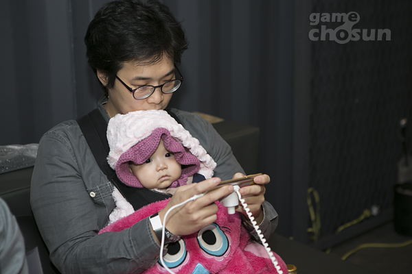 ▲ 아빠 품의 아기는 전면에 위치한 TV로 아빠의 플레이 영상을 감상 중