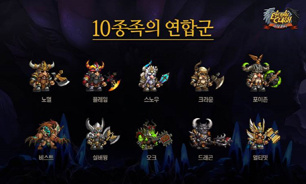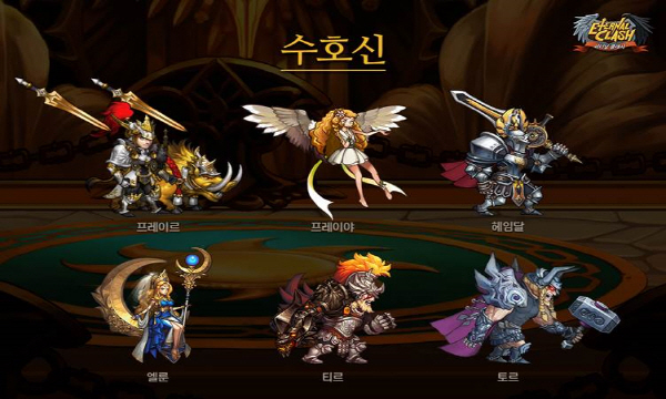 '이터널클래시'는 7개의 클래스와 10개의 종족이 연합군을 이뤄 언데드의 파상공세를 막아내는 게임이다. 모든 클래스와 종족은 고유의 장단점이 있어 이를 파악하고 효율적으로 배치하는 것이 게임의 가장 큰 재미다. 그 중 백미는 불리한 상황에 처했을 때 천둥의 신 토르, 풍요의 신 프레이르, 달의 여신 엘룬 등의 수호신 도움을 청해 전세를 역전시키는 재미다.