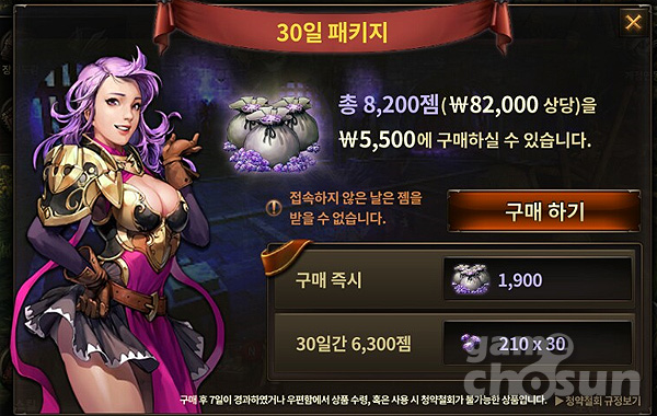 30일 패키지는 매일 게임에 접속할 때마다 210개의 젬을 30일간 제공하고 구매 즉시 1900개의 젬을 증정하는 상품이다. 게임을 꾸준히 접속하는 경우 총 8200개의 젬을 얻을 수 있어 가격 대비 가장 많은 보석을 얻을 수 있는 방법이다.