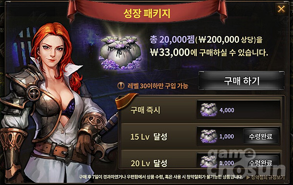 성장 패키지는 게임을 열심히 플레이하는 유저에게 더 많은 젬을 지급하는 상품이다. 성장 패키지의 핵심은 레벨업이다. 구매 즉시 4000개의 젬을 지급하고 특정 레벨 달성 때마다 추가로 보석을 지급하는 형태로 총 2만 개의 젬을 얻을 수 있다.