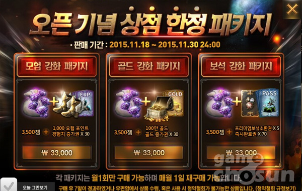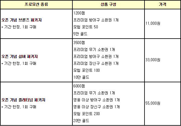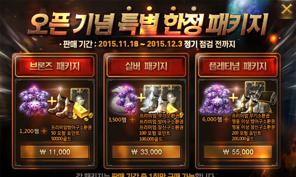 히트가 18일 정식 서비스를 기념해 12월 3일까지 한정 판매하는 한정 패키지는 젬과 소환권을 중심으로 상품을 구성하고 있다. 특히 플레티넘 패키지에 포함된 영웅 이상 방어구/장신구 소환권은 영웅 이상, 고대/전설/불멸 아이템이 소환되어 가치가 매우 높다.