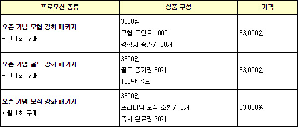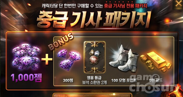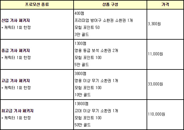 신입 기사 패키지는 보석과 프리미엄 방어구 소환권, 모험포인트와 3만 골드를 지급하고 중급 기사와 고급 기사 패키지는 이 보다 제공되는 혜택이 큰 방식이다.