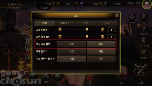 특히, 설정 메뉴의 게임 탭에서는 컷신을 2배속으로 보여주는 기능을 항시 적용시킬 수 있다. 영상 배속 설정을 '켜짐' 설정하면 플레이 도중 보스 몬스터가 등장할 때마다 나오는 컷신의 화살표 모양을 터치하지 않아도 자동으로 2배속 재생된다.