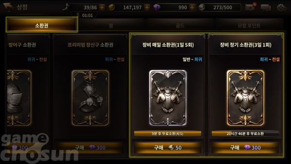 장비 매일 소환권은 1일 5회, 일반~희귀 등급의 장비를 무료로 얻을 수 있으며 장비 정기 소환권은 3일 1회, 희귀~ 전설 등급 장비 획득이 가능하다.