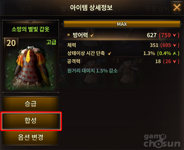 여기서 주의할 점은 합성할 때 반드시 얻고자 하는 부위의 아이템을 클릭해 합성을 진행해야 한다는 것. 만약 영웅 등급 가슴 방어구를 획득하고자 한다면, 재료가 되는 희귀 등급 20레벨 가슴 방어구와 20레벨 장갑 보호구 중 가슴 방어구를 클릭해 합성을 진행해야 한다. 그렇지 않고 장갑 보호구를 클릭해 합성을 진행하게 되면 영웅 등급의 장갑 보호구가 나오게 되므로 주의하도록 하자.
