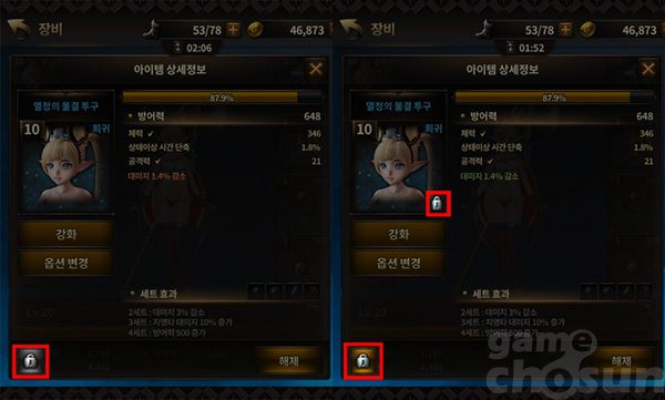 ▲ 잠긴 아이템은 잠금 아이콘이 노란색으로 변화하며, 장비 아이콘 우측 하단에 자물쇠 표시가 생긴다.