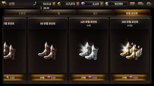 첫 번째는 가장 손쉽지만 캐시아이템이 소모되는 방법으로 상점에서 젬으로 모험 포인트를 구매하는 것. 상점에서 모험 포인트는 50개에 100젬, 125개에 250젬, 250개에 500젬이다.