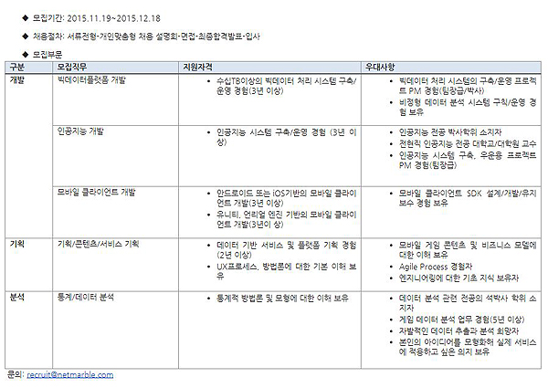 모집직무는 ▲빅데이터플랫폼 개발▲인공지능 개발▲모바일 클라이언트 개발▲게임∙콘텐츠∙서비스 기획▲통계/데이터 분석이며, 동종 분야 3년 이상 경력의 전문가, 관련 석박사 또는 전∙현직 교수 및 강사 등 학계 전문가를 우대한다.