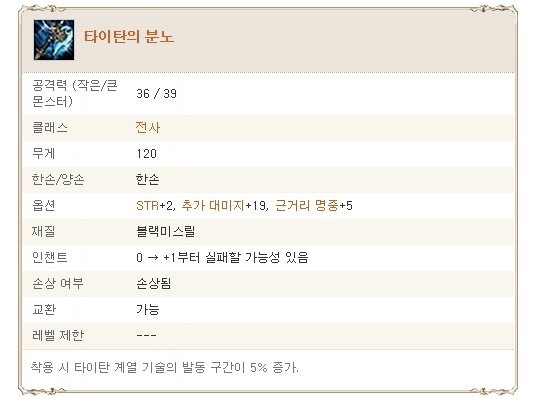 타이탄의 분노에는 공격력 36/39, 추가 대미지 +19 등 뛰어난 기본 옵션 외에도 '착용 시 타이탄 계열 기술 발동 구간 5% 증가'가 부여되는 특수 옵션이 부여되어 있으며 쌍수 장착 시 중복으로 적용되기 때문에 가치를 더하고 있다.