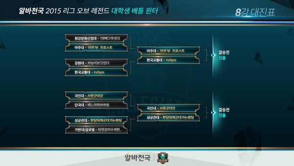 이로써 전국 각 지역을 돌려 지역 대표 선발전을 시작으로 숨 가쁘게 달려온 알바천국 2015 리그 오브 레전드 대학생 배틀 윈터는 총 4개의 대학만 남게 됐다. 12월 5일(토) 오후 1시부터 ‘아주대’와 ‘한국교통대’의 4강전 첫 경기를 시작으로 오후 4시에는 ‘국민대’와 ‘성균관대’의 경기가 펼쳐질 예정이며, 서울/경기도 지역 대표가 이미 결승전 한 자리를 예약한 가운데, 한국교통대가 충청도 지역의 명예를 걸고 결승전에 진출할지도 초미의 관심사다.