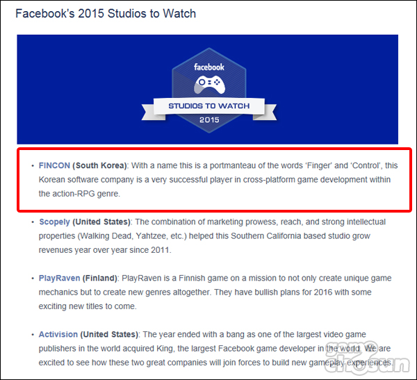 한국시각으로 10일 페이스북은 '2015 올해의 게임(Facebook's 2015 Games of the Year)'라는 뉴스를 통해 게임 장르와 분야별 최고 회사 및 타이틀을 소개했는데 그중 '2015 올해의 주목할 회사(Facebook's 2015 Studios to Watch)'라는 코너에서 한국의 핀콘사가 소개돼 눈길을 끌고 있다.