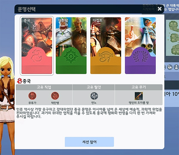 다른 문명으로 플레이하고 싶어도 캐릭터의 시민 등급을 포기할 수 없어 세션을 옮기지 못하는 유저를 위해 세션에 처음 입장할 때 문명을 선택할 수 있는 기능이 추가된다.