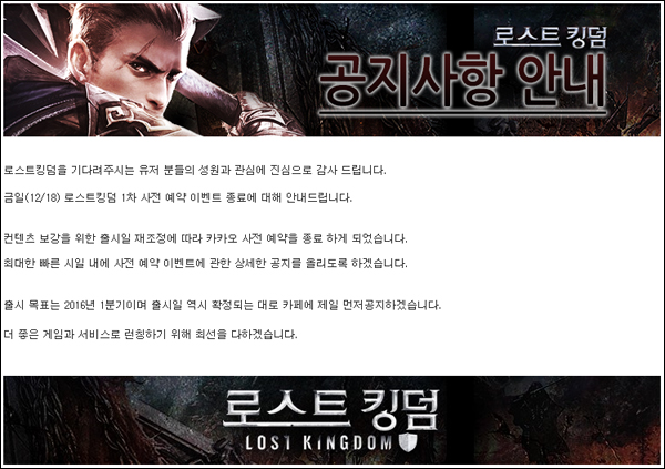로스트킹덤은 원래 이달 중 출시될 예정이었지만 콘텐츠 보강과 안정적인 서비스를 위해 2016년 1분기로 출시일을 연기했고 이에 따라 유저들 사이에서는 2차 사전 예약 일정과 정식 출시일에 대한 기대감이 커지고 있는 상황이다.