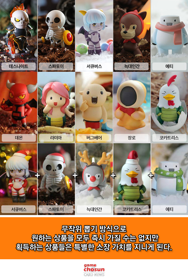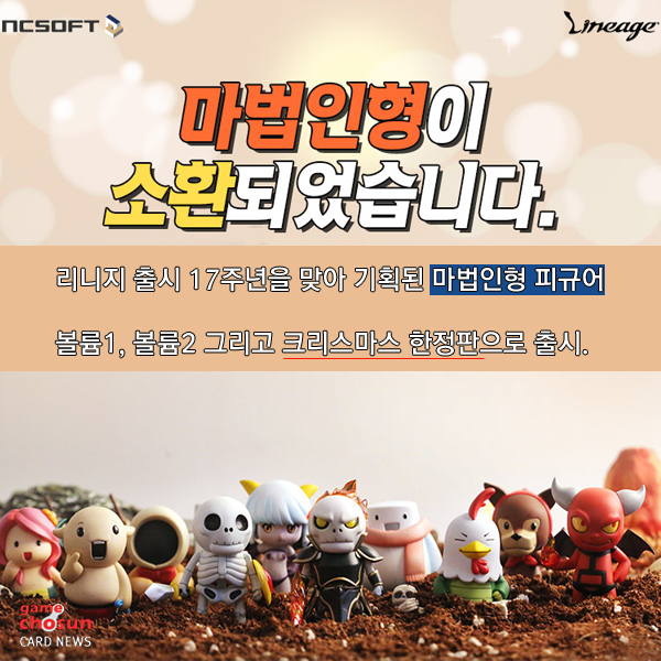 엔씨소프트의 '리니지'가 출시 17주년을 기념해 '마법 인형 피규어'를 22일 출시했다. 이번 마법인형 피규어는 3가지 세트로, 볼륨1과 볼륨2, 마법인형 피규어 크리스마스 한정판으로 제작됐다. 볼륨1과 볼륨2 세트는 각각 5가지 피규어로 구성됐으며 구매자는 1개의 피규어를 무작위 뽑기 방식으로 획득할 수 있다. 아래는 '마법인형 피규어' 판매에 대한 카드뉴스다.