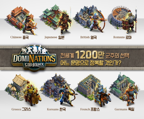 '도미네이션즈'는 한국을 비롯한 영국, 로마, 중국, 독일, 그리스, 일본, 프랑스 국가 중 하나를 선택해 시대의 따라 자신의 국가를 발전시키는 모바일 전략게임이다.