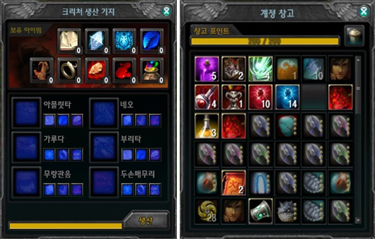 ▲ 재료를 모으면 거대한 크리처를 생산할 수 있었다. 왼쪽은 캐쉬템을 비롯한 개인 아이템을 불러올 수 있는 계정 창고