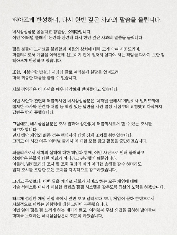 8일 소태환, 장원상 4:33 공동대표는 '이터널클래시' 공식 카페를 통해 장문의 사과문을 올렸다. 지난 5일 첫 번째 사과문을 게재한 지 3일 만에 '뼈아프게 반성한다'며 다시 한 번 사과의 뜻을 전했다.
