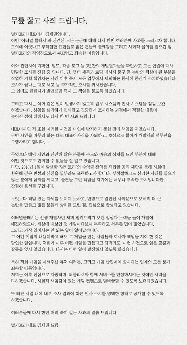 모바일게임 개발사 벌키트리가 신작 '이터널클래시' 논란에 대해 다시 한 번 사과문을 내놓았다. 김세권 벌키트리 대표는 모든 책임을 지고 대표이사직 사퇴를 결정했다.