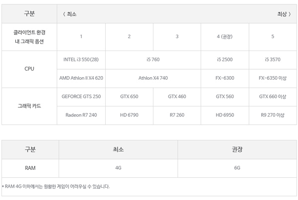 더불어 그래픽카드는 GTX560을 권장하고 있지만 일반적인 플레이에는 GTX460까지 무리없다. 대규모 전투를 즐길 예정이라면 그래픽 카드는 GTX660 이상이 되야 끊김없이 플레이 할 수 있다.