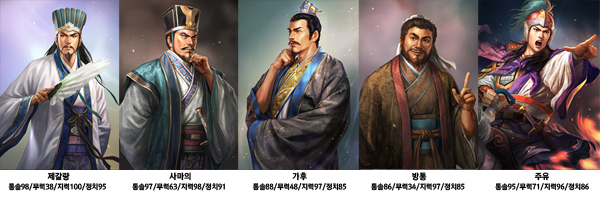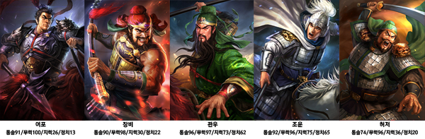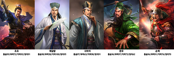 4가지 항목에 능력이 고루 분포된 안정적인 영웅도 있지만 특정 항목에 강점을 지닌 개성넘치는 장수도 존재한다. 이처럼 다양한 수치의 능력을 지닌 영웅들이 한데 어우러져 새로운 이야기와 역사를 써내려가게 된다.