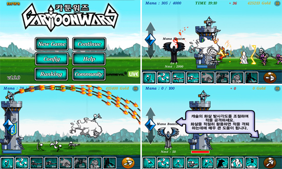 카툰워즈 시리즈는 카툰 스타일의 귀여운 캐릭터와 배경을 기반으로 몰려오는 적들을 물리치며 유닛과 건물을 업그레이드하는 모바일 디펜스게임이다.