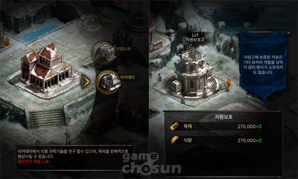▲ 기술과 자원에 중점을 둔 유저라면 아카데미(좌)와 자원보호고(우) 업그레이드도 고려해볼 만하다.
