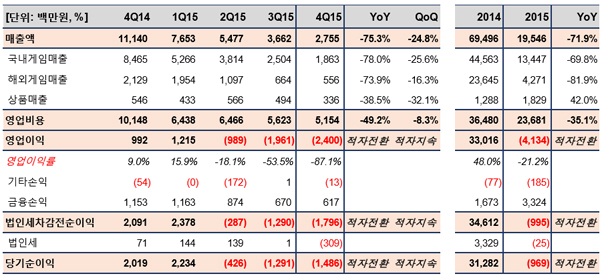 회사 측은 "기존 게임 서비스의 장기화와 신작 게임 출시 지연에 따른 결과로 매출 및 손익이 감소했다"고 실적 부진 원인을 꼽았다.