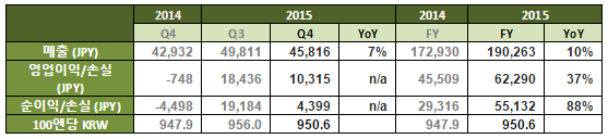 2015년 연간 실적은 연매출 1조8086억원(1902억6300만엔, 100엔당 950.6원 기준)을 기록해 전년대비 10% 상승했으며, 영업이익은 5921억원(622억9000만엔), 순이익은 5241억원(551억3200만엔)으로 전년대비 각각 37%, 88%씩 증가했다.