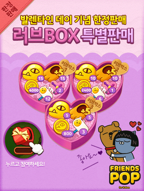 먼저 연인에게 선물할 특별한 선물을 고민하는 유저들을 위해 '프렌즈팝 러브 박스' 3종이 판매된다. 황금콘, 튜브의 신발+5, 무지망치, 하트 등으로 구성된 러브 박스는 정가 대비 최대 57% 할인된 가격으로 만나볼 수 있다.