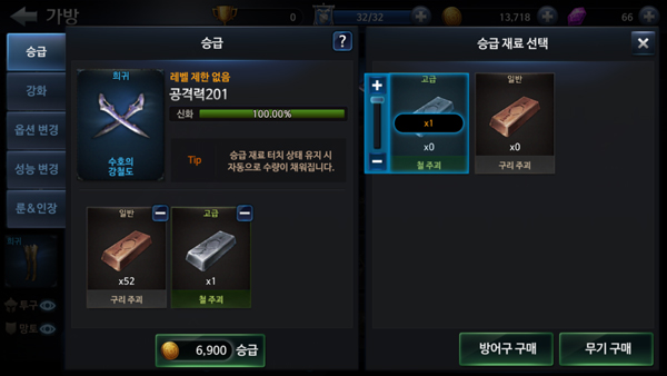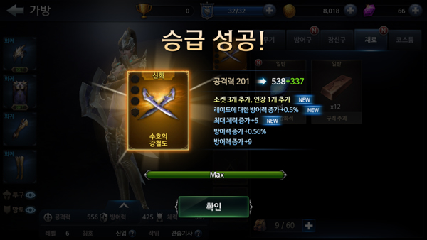 대략 5레벨 정도에는 아이템 하나에 승급을 올인하면 충분히 최상위 등급인 '신화'로 올릴 수 있으며 이에 따라 쾌적한 전투를 할 수 있다.
